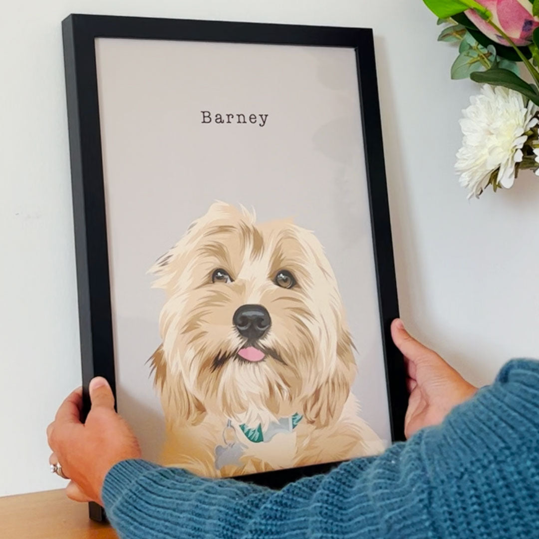 When it comes to creating Custom Portraits of Dogs from photos, Oh Barney are the experts in the field. We've created thousands of Custom Dog Portraits for Dogs of all shapes, sizes and colours. You can trust Oh Barney to highlight your Dog's personality, characteristics and colouring within your Custom Dog Portrait. Easily upload photos of your Dog through our ordering system, treats may be needed to make your dog sit still! Select from an unframed Dog Portrait Print or opt for one of our Black, White or Timber Frames to finish your Framed Dog Portrait.