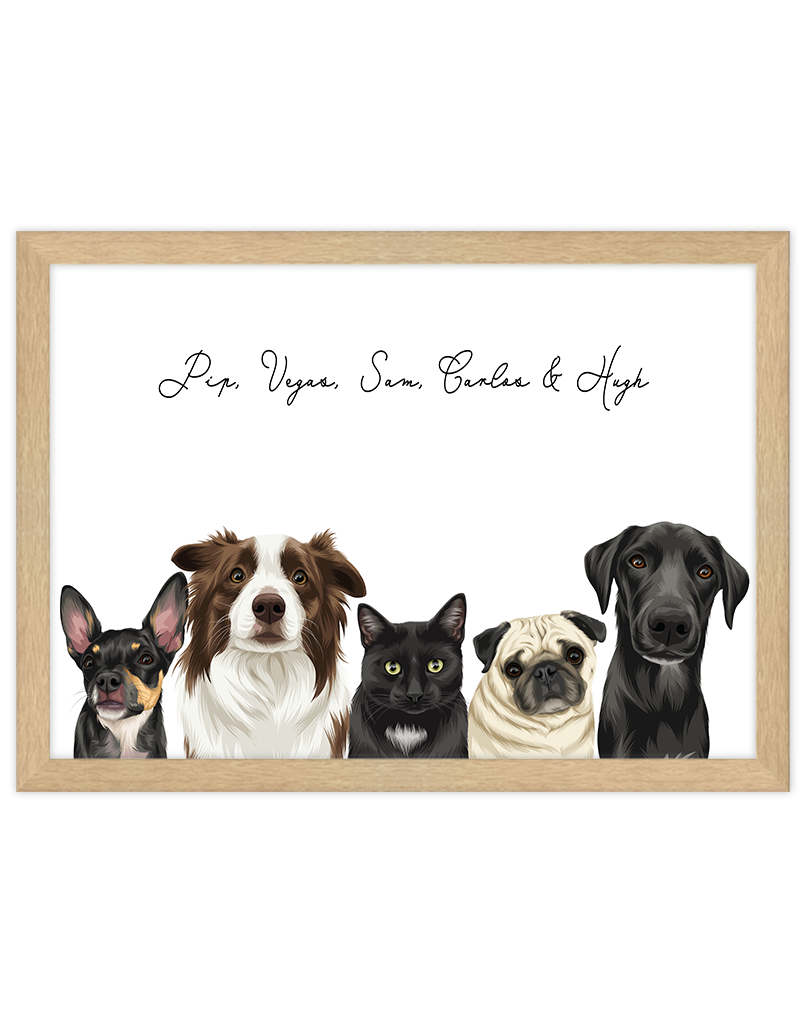Easily upload photos of your Pets and select design options to create your truly personalised digital Pet Portrait. Opt for a Professionally Printed Unframed 5 Pet Portrait or opt for your 5 Pet Portrait to be framed in our premium quality Black, White or Timber frames.